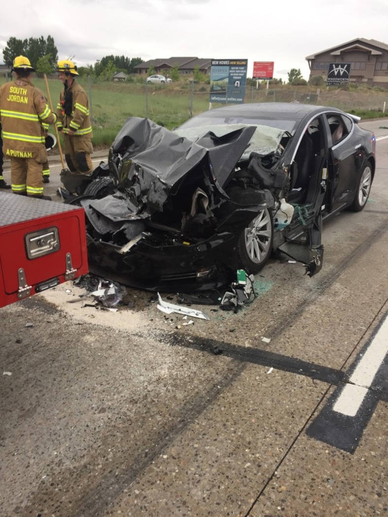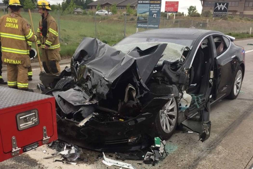 South Jordan police said the Tesla Model S was going 60 mph when it slammed into the back of a fire truck stopped at a red light. The car appeared not to brake before impact, police said.