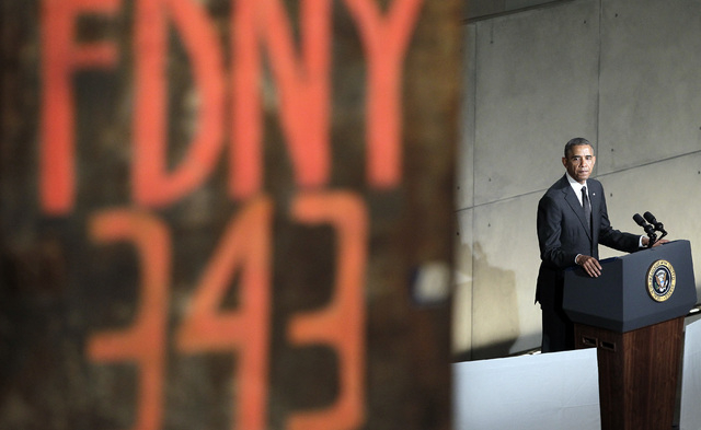 After viewing some of the exhibits, including a mangled fire truck and a memorial wall with photos of victims, Obama retold the story of Welles Crowther, a 24-year-old World Trade Center worker who became known as “the man in the red bandanna” after he led others to safety from one of the towers. He died in the tower’s collapse.