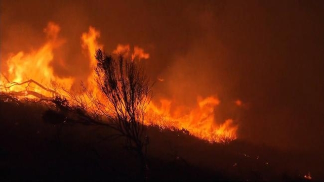Crews on 10 to 15 fire engines fought the flames Saturday morning, trying to protect structures and contain "fire that's up and down the hill," according to Kaufmann.