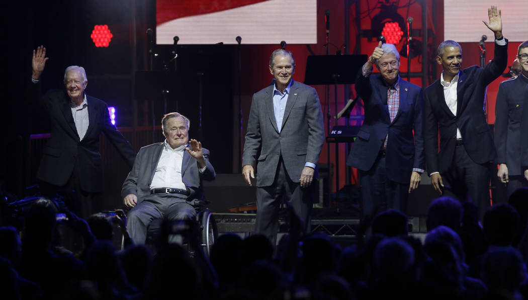 Democrats Barack Obama, Bill Clinton and Jimmy Carter and Republicans George H.W. and George W. Bush gathered on stage in College Station, Texas, home of Texas A&M University, putting aside politics to try to unite the country after the storms.