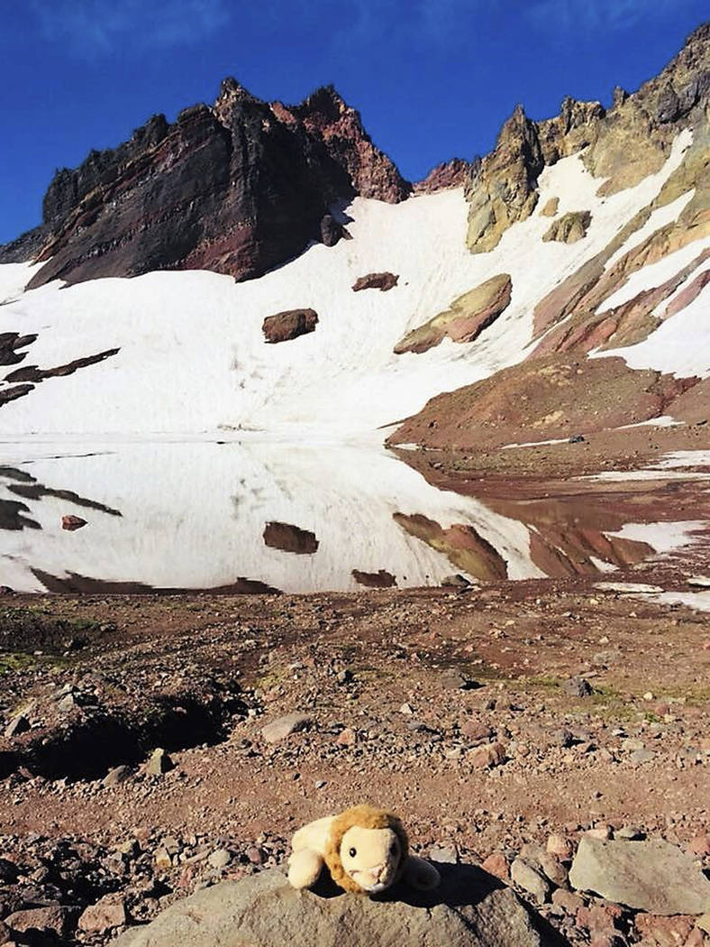 She didn’t have the family’s name or number. So she put Kitty on a rock and snapped a photo of the well-loved beige-and-yellow lion in front of jagged peaks of Broken Top Mountain — snow in the background — and posted it online when she got home.