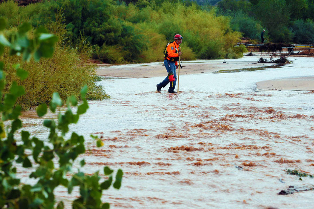 Within the span of four days, a total of 30 MCSO SAR volunteers had responded to four incidents, including the rescue of three individuals. The equipment needed for these types of missions include ropes, carabineers, equipment for a swift water rescue, maps and four wheel drive vehicles for an extended search in the Arizona Strip, cadaver dogs, personal flotation devices and long poles to search flooded wash bottoms, just to mention a few.