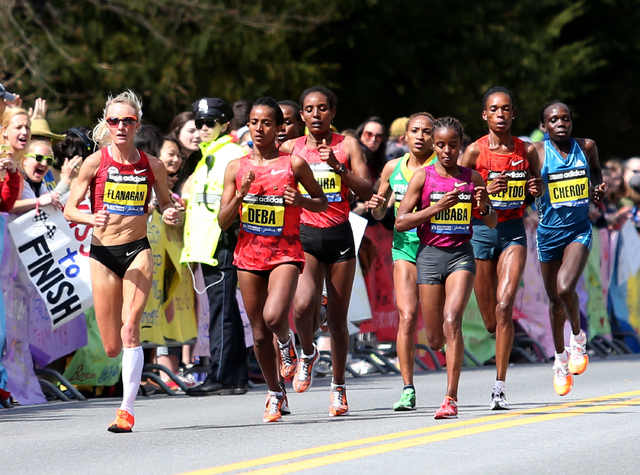 Kenya’s Rita Jeptoo won the women’s race in a course-record 2 hours, 18 minutes, 57 seconds, defending the title she won last year but could not celebrate because of the tragedy.
