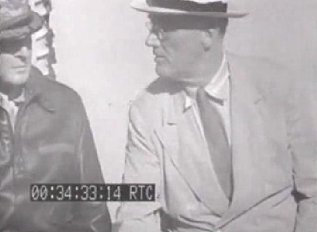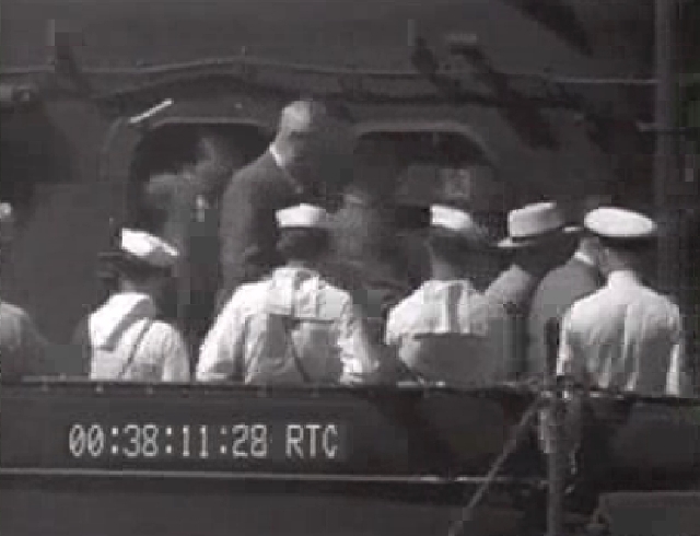 The film shows Roosevelt visiting the U.S.S. Baltimore at Pearl Harbor in July 1944. Eight seconds of the clip show Roosevelt exiting a doorway on the ship and being escorted down what is apparently a ramp. The wheelchair is not clearly visible because the view of the president is screened by a line of sailors — perhaps deliberately — but Roosevelt’s distinctive white hat can be seen gliding past the men at a lower level. Roosevelt, at 6-foot-2, was likely taller than most of the soldiers.