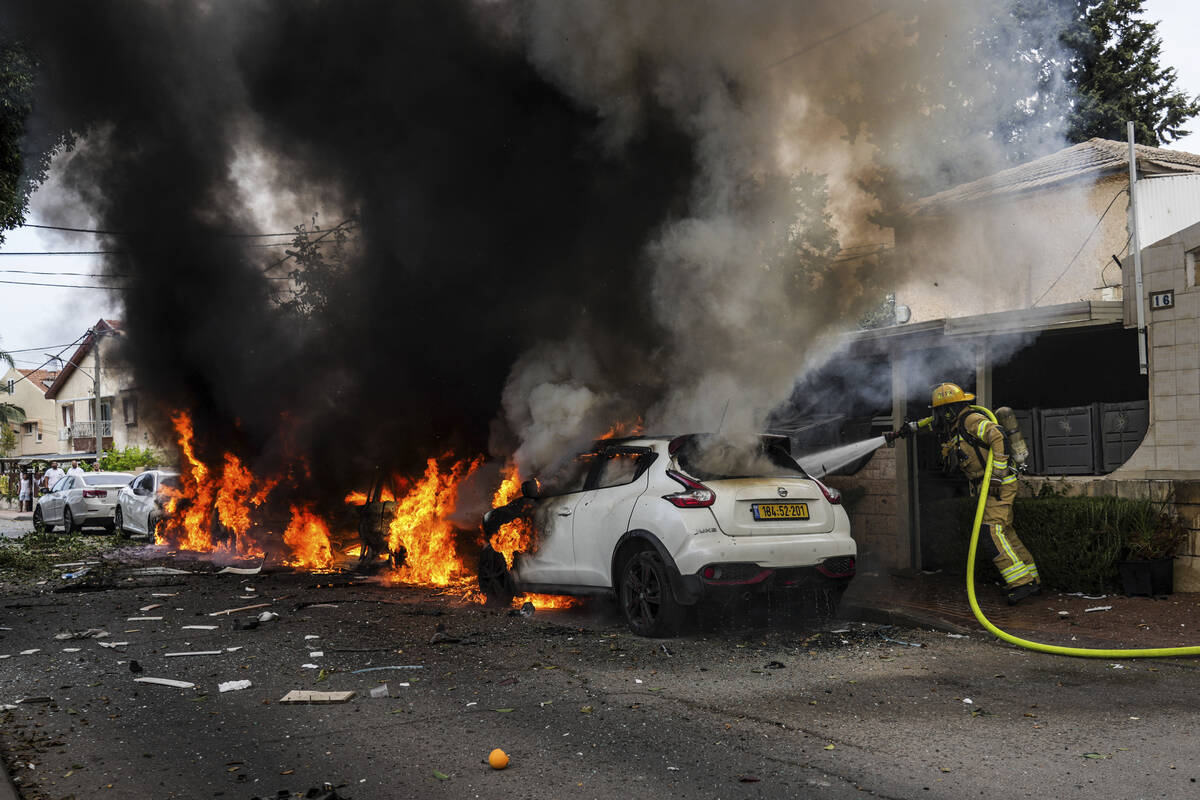 In Israel’s southern coastal city of Ashkelon, a man holding a crutch with one hand and an older boy with the other joined evacuees being shepherded from a street after a rocket blew out the front of a house. The blast shattered windows and set cars on fire.