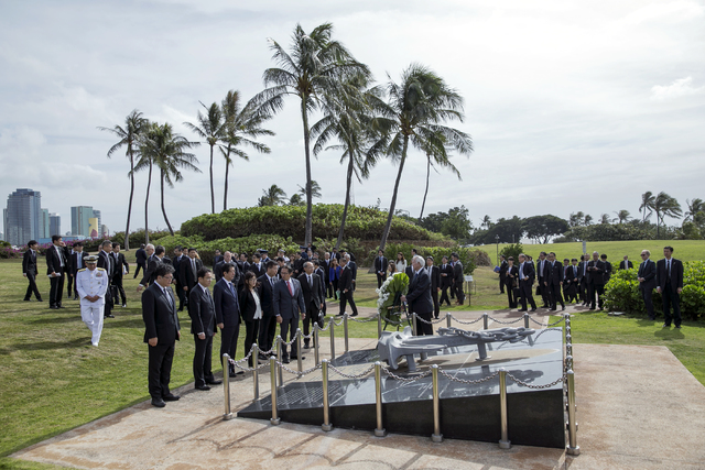 Abe landed at Joint Base Pearl Harbor-Hickam and then headed to National Memorial Cemetery of the Pacific, where he laid a wreath. He stood for a moment of silence at the cemetery near downtown Honolulu, which is known as Punchbowl.