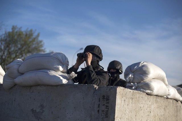 At least 10 Ukrainian government armored vehicles were seen on the road north of Slovyansk and two helicopters circled over the area. Troops ordered residents to keep away during the operation.