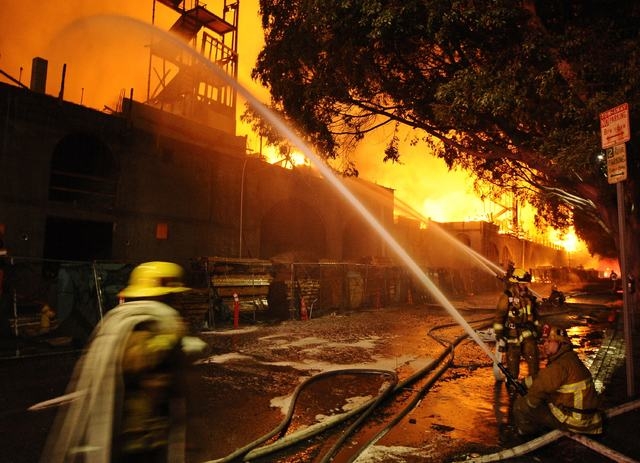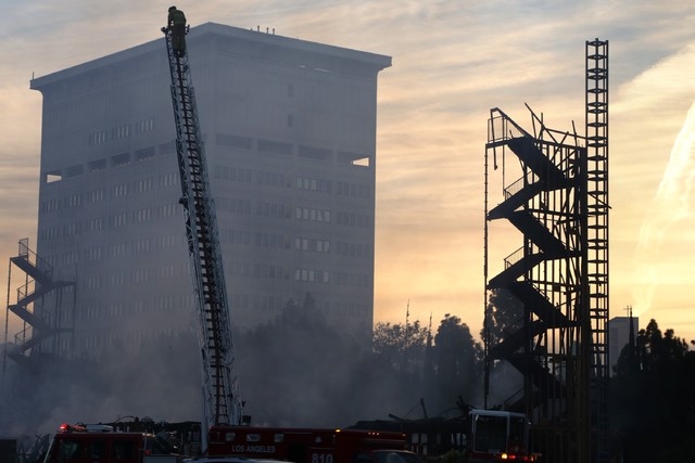 The fire spread to two neighboring buildings, including an office building on Figueroa Street, where several stories were damaged by fire and water.