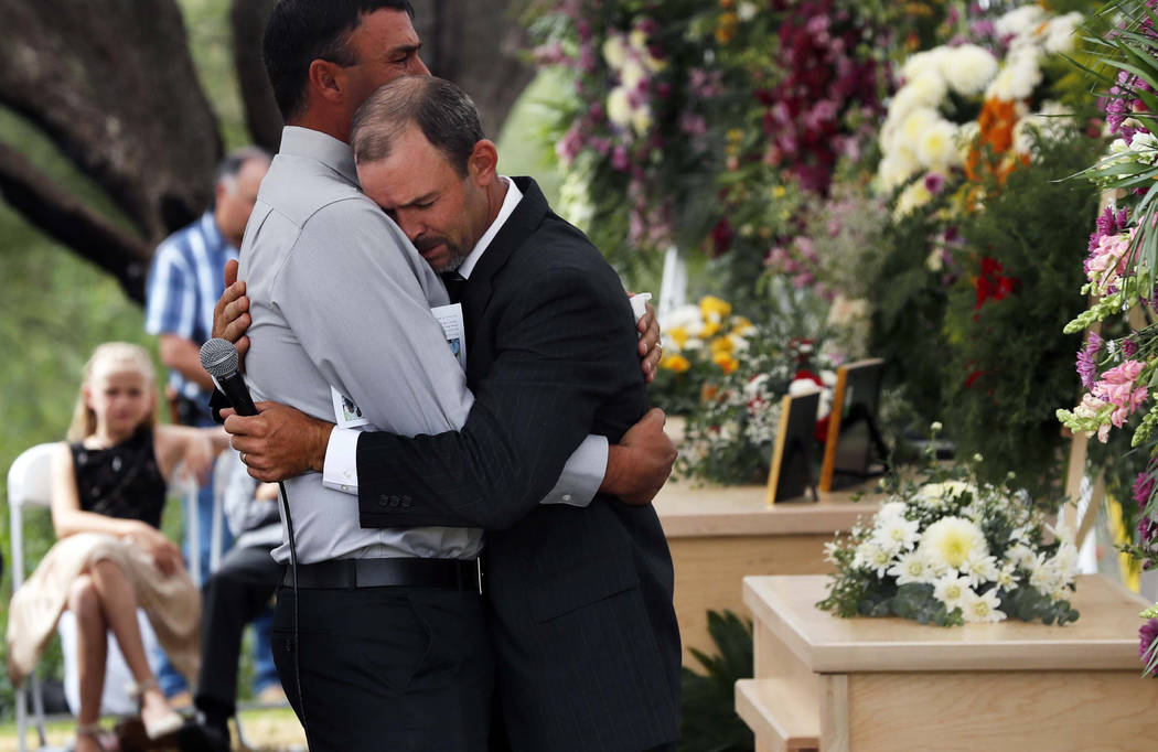 The first funeral was for a mother and two sons who were laid to rest in hand-hewn pine coffins in a single grave dug out of the rocky soil. Clad in shirt sleeves, suits or modest dresses, about 500 mourners embraced in grief under white tents. Some wept, and some sang hymns.