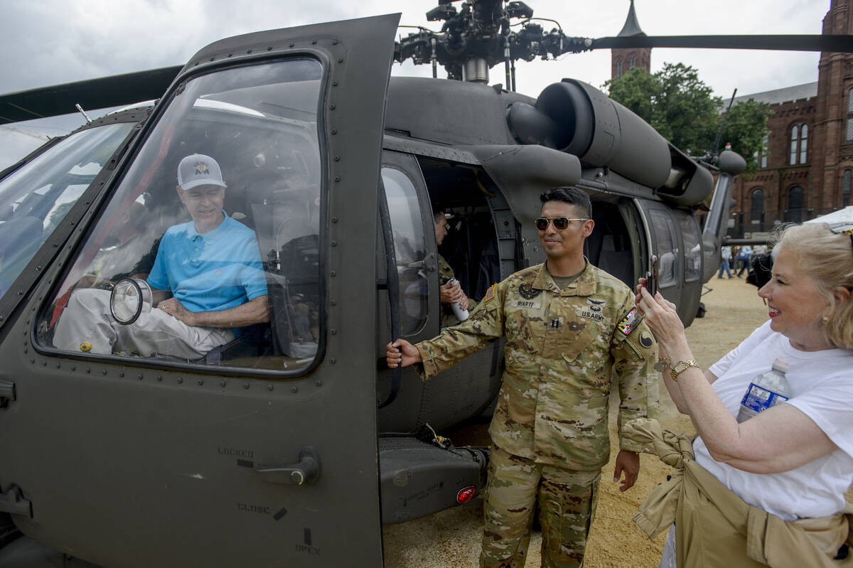 The parade wound down Constitution Avenue, lined with security fencing and barriers. A flyover of military aircraft included World War II-era planes, including a B-25 Mitchell bomber, and Army helicopters flew low over the crowd, below the top of the Washington Monument. Mounted soldiers from the 1st Cavalry Division made an appearance — horses once played a crucial role in warfare, but today they’re mostly used in ceremonial events like today’s parade.