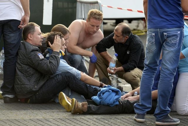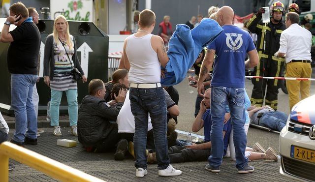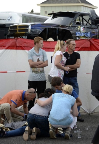Paramedics attend to the wounded at a monster truck festival in Haaksbergen September 28, 2014. Three people were killed, including a child, when a giant pick-up truck spun out of control while attempting to perform a stunt demonstration in the Dutch city of Haaksbergen on Sunday, Dutch public television quoted the local mayor as saying. REUTERS/Eric Brinkhorst