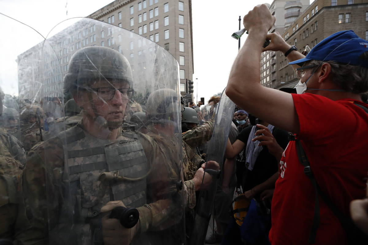 Hundreds of protesters stood face to face with military and federal officers who had formed a perimeter around Lafayette Park across from the White House. Military vehicles were parked on nearby streets, also blocking access.