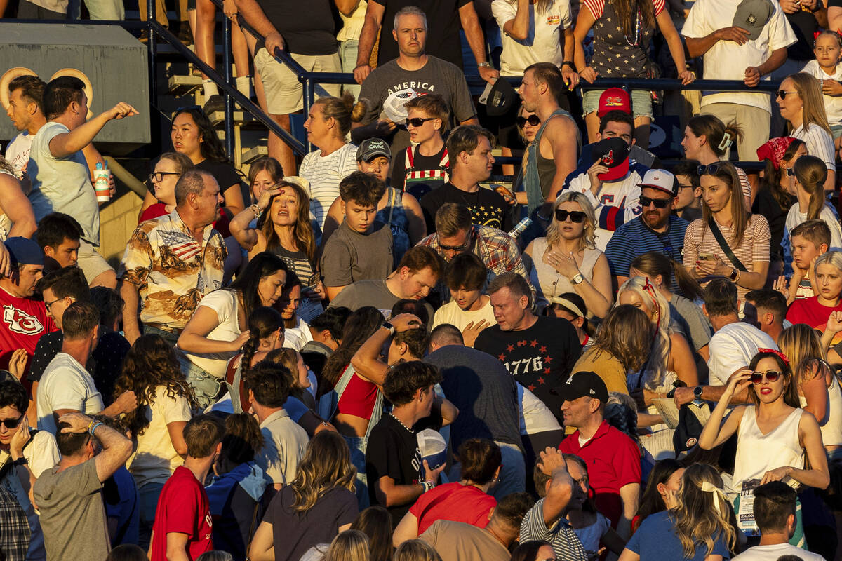 Videos posted on social media show individual fireworks veering off from the cluster sent into the sky over the field and landing among rows of spectators in the stands at the outdoor arena. About 45,000 people attended the sold-out show, Cook said.