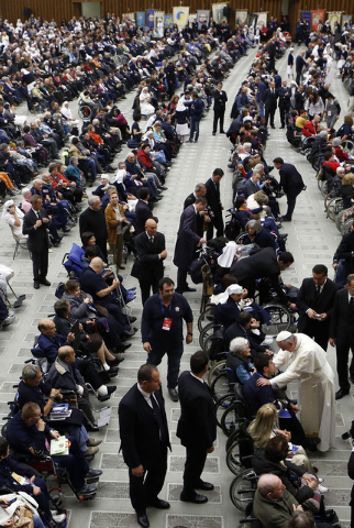 VATICAN CITY — Pope Francis has greeted hundreds of people in wheelchairs one-by-one — part of a special gathering in which rows of seats were removed from a Vatican auditorium to make room for the disabled visitors.