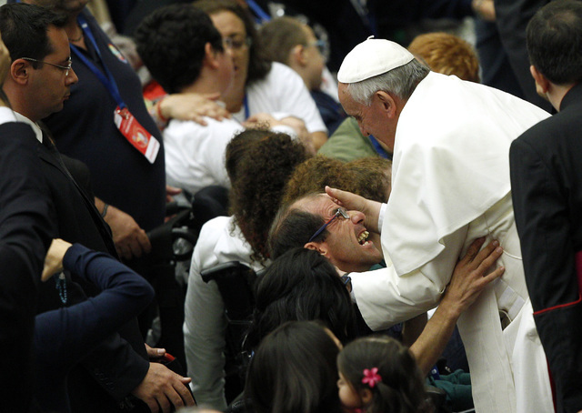 Some 600 people in wheelchairs waited to have their time with Francis during the event Saturday. He moved down the rows to greet each person, doling out hugs and kisses as well as chatting.