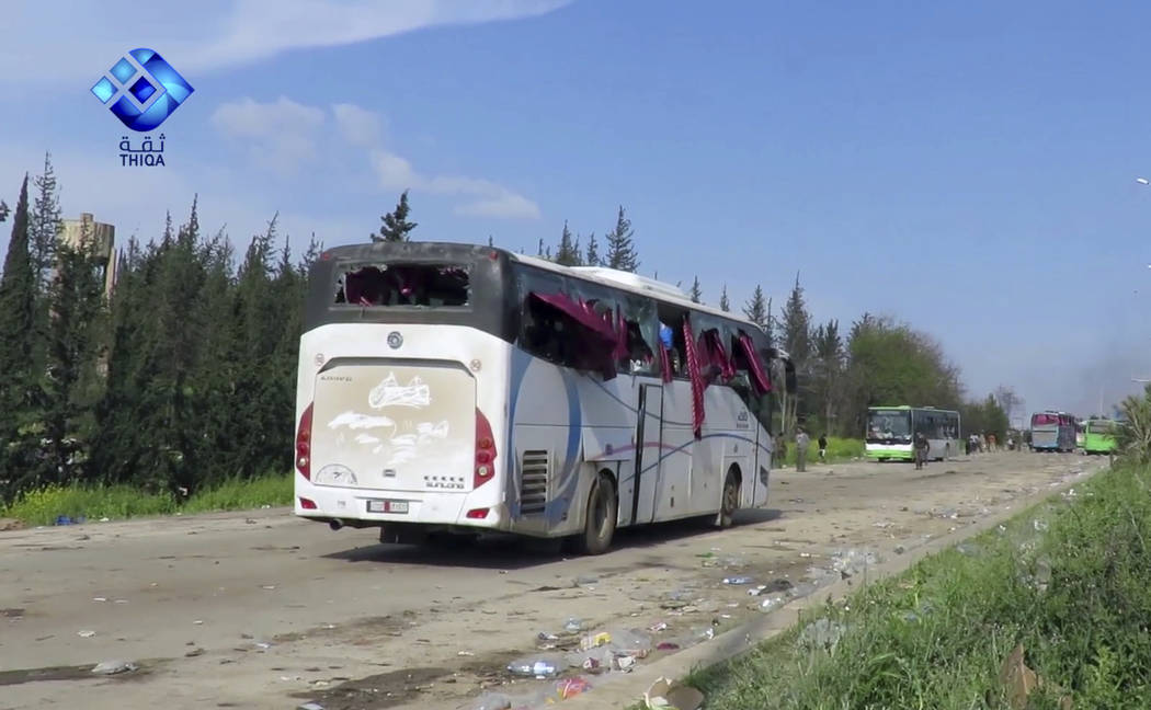 The explosion hit the al-Rashideen area, a rebel-controlled district outside Aleppo city where evacuation buses carrying nearly 5,000 people from the northern rebel-besieged villages of Foua and Kfraya were stuck. Residents from the two villages had been evacuated Friday, along with more than 2,000 from Madaya, an opposition-held town outside of Damascus besieged by government forces.