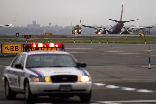 Officials say the front landing gear of a plane arriving at New York’s LaGuardia Airport collapsed as the aircraft touched down on the runway. The Federal Aviation Administration says the plane landed safely.