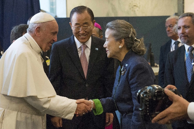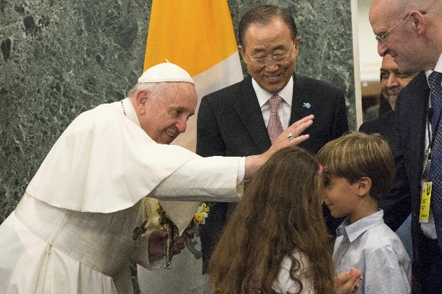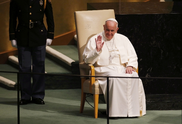 Francis called on government leaders to fight human trafficking, ban nuclear arms and promote the education of girls. Among those in the audience were Cuban President Raul Castro and Malala Yousafzai, the 18-year-old Pakistani campaigner for girls' rights to schooling.