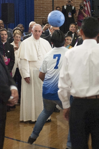 The pope, who arrived in New York on Thursday night, earlier was serenaded by schoolchildren during a visit to a Catholic elementary school serving mostly Latino and black children in the city's East Harlem neighborhood, speaking with individual students at Our Lady Queen of Angels School.