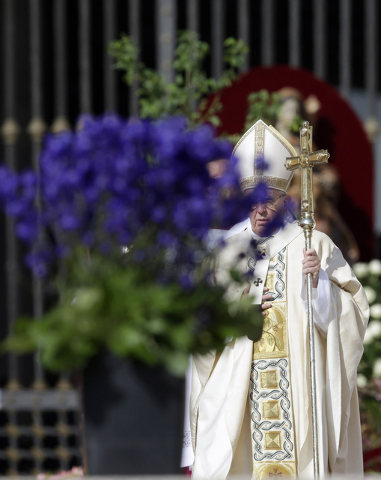 To their delight, Francis completed a whirl through the square, made colorful with sprays of tulips and other spring flowers, in his open-topped pope-mobile after celebrating Mass on the steps of the basilica. He leaned over barriers to shake hands, as the vehicle ventured past the Vatican’s confines, with his bodyguards jogging alongside on the boulevard.
