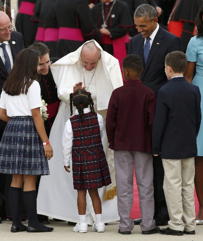 The flags of the United States and the Vatican flapped from the cockpit windows of the pope's chartered Italian jet as it rolled to a stop near a line of priests in black and red robes and a group of children from local Catholic schools. The Argentine-born pope appeared at the top of the stairs of the plane in a white cassock, smiled and removed his skullcap so it would not be blown away by the wind. Obama greeted him at the foot of the steps with a handshake and a warm smile.