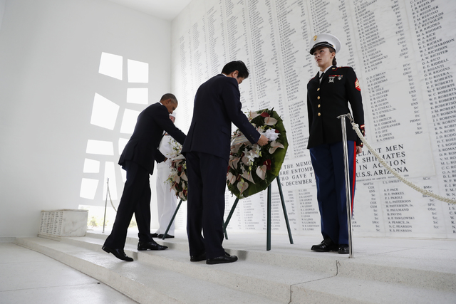 After a formal meeting, they placed a pair of green-and-peach wreaths made of lilies aboard the USS Arizona Memorial and tossed purple flower petals into the water.