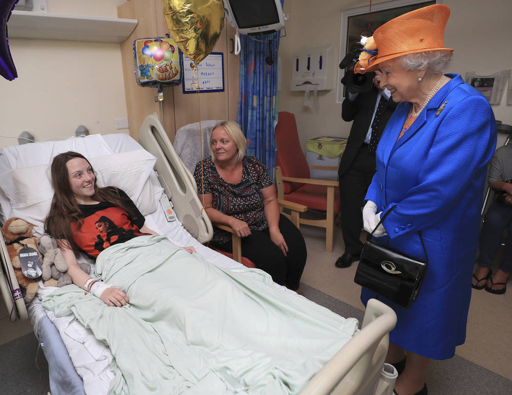 The 91-year-old monarch visited Evie Mills, 14, Millie Robson, 15, and other youngsters recovering from severe shrapnel wounds at the Royal Manchester Children’s Hospital.