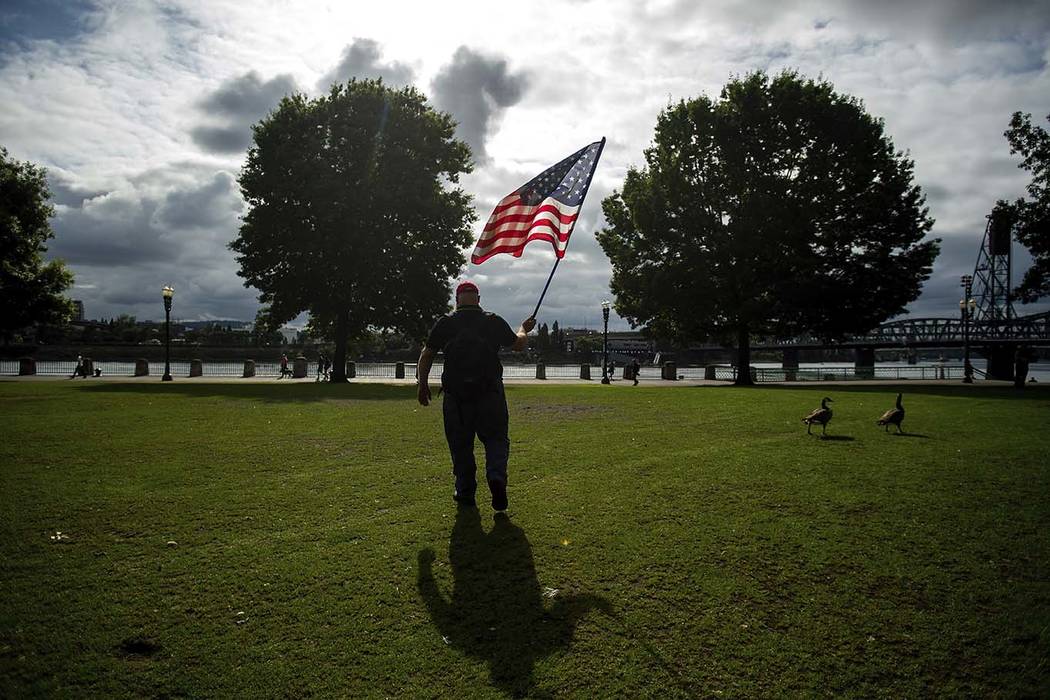 Late in the morning flag-waving members of the Proud Boys, Three Percenters militia group and others gathered downtown, some also wearing body armor and helmets. Police said they had seized the weapons, including shields, from multiple groups as they assembled along the Willamette River, which runs through the city.