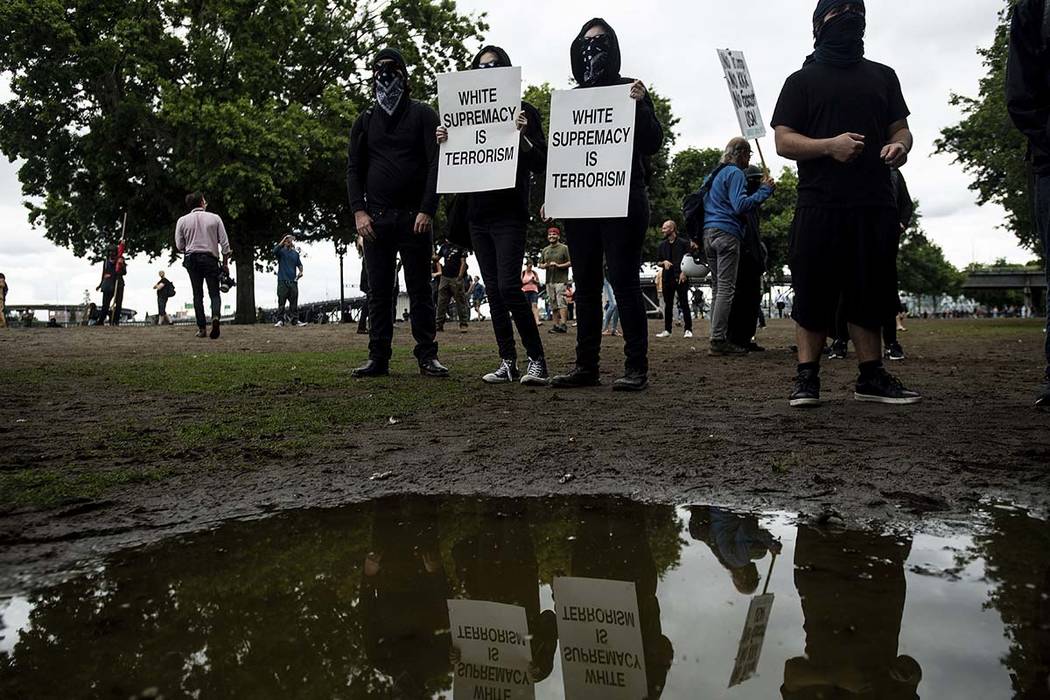 The city’s mayor said the situation was “potentially dangerous and volatile.” As of early afternoon, most of the right-wing groups had left the area via a downtown bridge and police used officers on bikes and in riot gear to keep black clad, helmet and mask-wearing anti-fascist protesters — known as antifa — from following them.