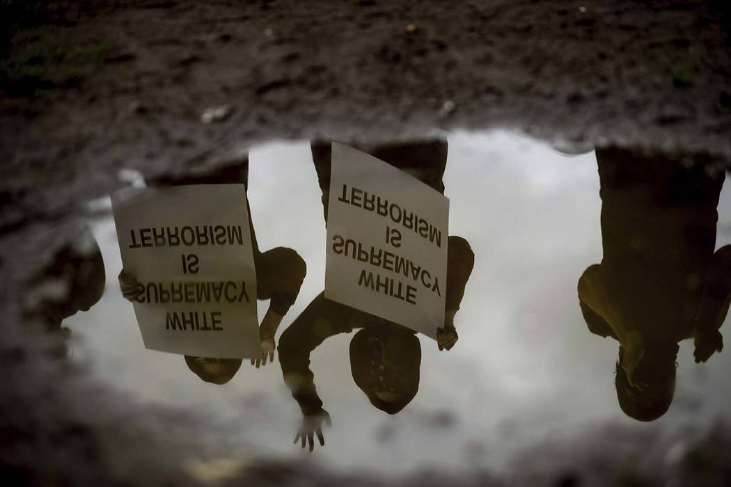 Not all who gathered Saturday were with right-wing groups or antifa. Also on hand were people dressed in colorful outfits and those who attended a nearby prayer service, holding signs that said slogans such as “No Trump, No NRA.”