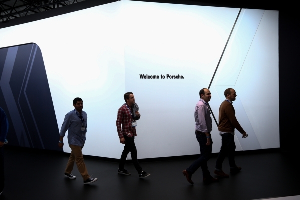 Attendees pass by a sign welcoming people to the Porsche booth during the Los Angeles Auto Show on Thursday, Nov. 19, 2015. Chase Stevens/Las Vegas Review-Journal Follow @csstevensphoto