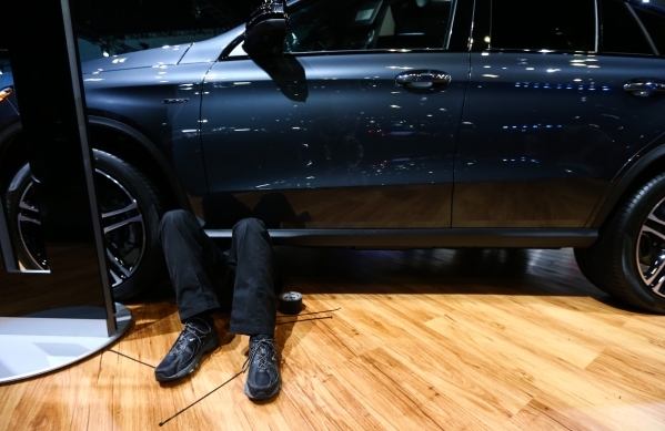 A technician makes adjustments on a 2016 Mercedes-Benz GLE 450 AMG Coupe during the Los Angeles Auto Show on Thursday, Nov. 19, 2015. Chase Stevens/Las Vegas Review-Journal Follow @csstevensphoto