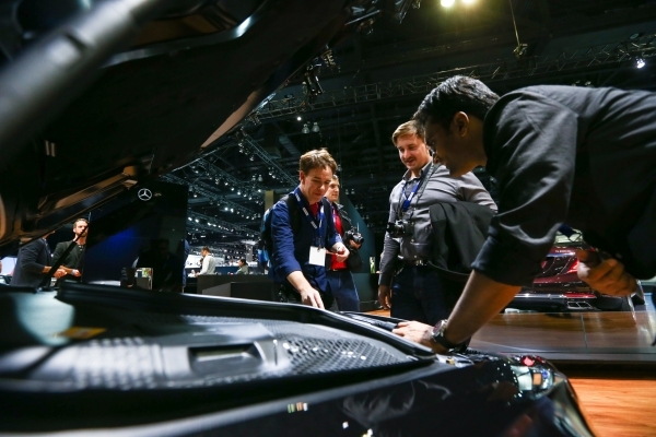 Attendees look at the engine of a Mercedes-Benz during the Los Angeles Auto Show on Thursday, Nov. 19, 2015. Chase Stevens/Las Vegas Review-Journal Follow @csstevensphoto
