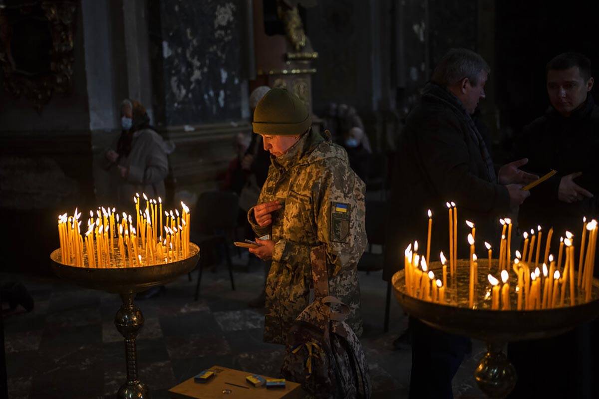 Their hands clasped in prayer and faces ridden with fear and sadness, some residents of Lviv sought consolation at a Sunday Mass at a Catholic church in the city in western Ukraine.