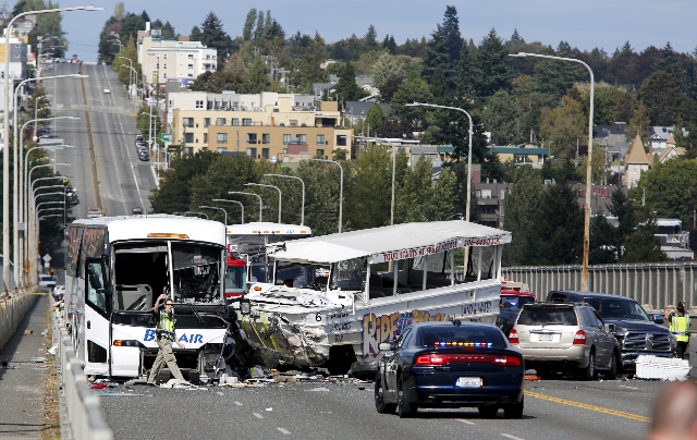 Officers investigate the scene of a crash between a Ride the Ducks vehicle and a charter bus on the Aurora Bridge in Seattle, Washington September 24, 2015. At least four people were killed and nine critically injured on Thursday when an amphibious tour bus collided with a charter bus on a Seattle bridge, the city‘s fire department said. (Jason Redmond/Reuters)