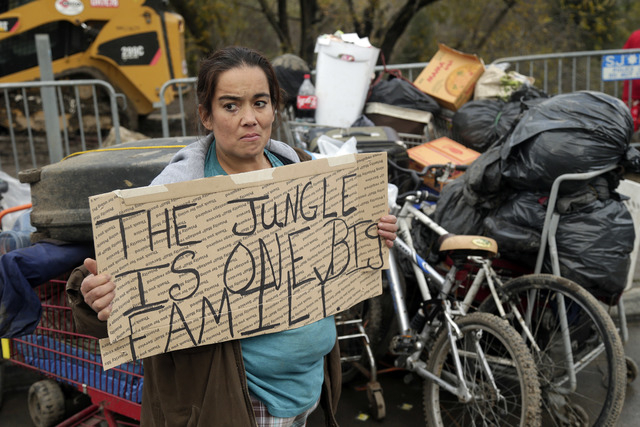 A few dozen protesters gathered at the site holding signs reading “Homeless people matter” and “Stand with The Jungle.”