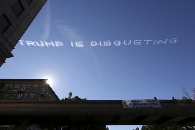 The planes circled for almost an hour after the parade of flower-adorned floats and marching bands finished, writing variations on a theme that included messages such as "Trump is delusional," and "Trump is a fascist dictator."