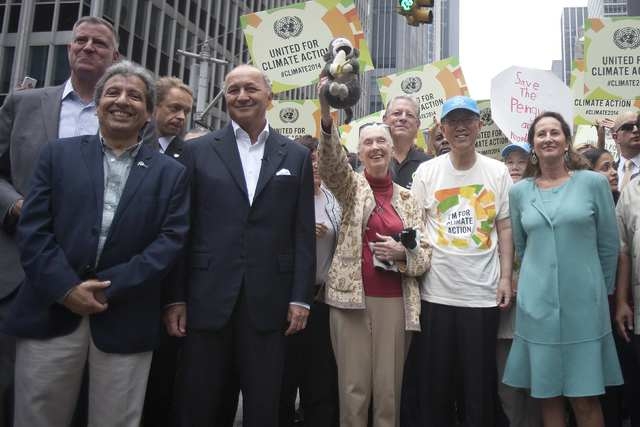 Ki-Moon, wearing a blue T-shirt that read “I’m for climate action” marched arm-in-arm with primatologist Jane Goodall and French Ecology Minister Segolene Royal.