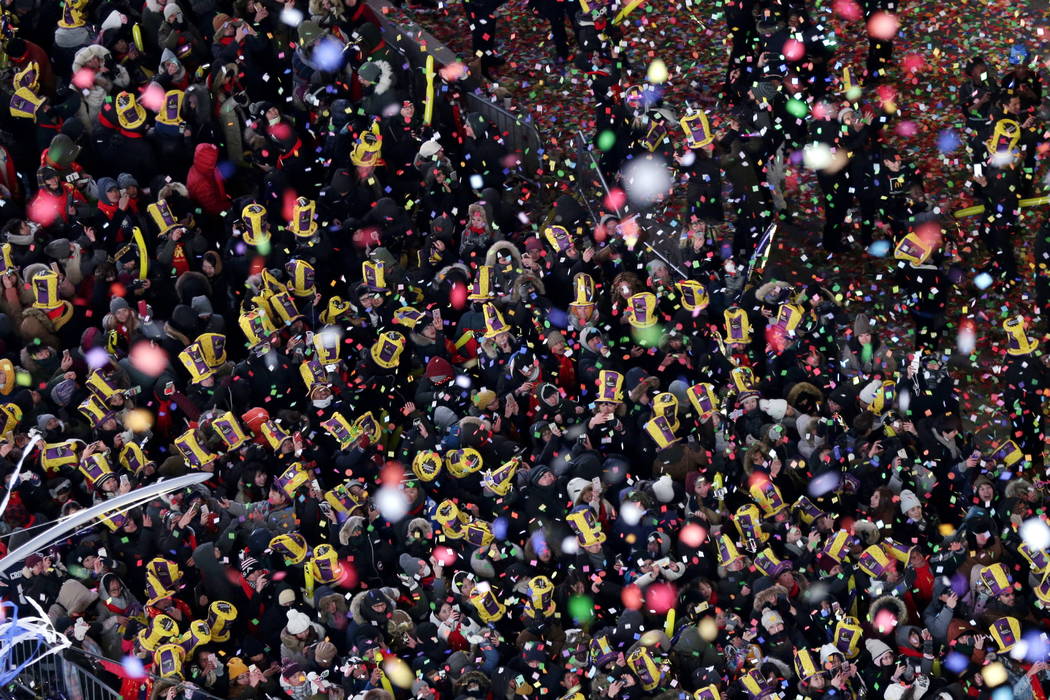 It was only 10 degrees Fahrenheit in the city, and the celebration was less crowded than other years. Some of the metal pens, usually packed with people, were only half-full. Some revelers, bundled up in hats, gloves, face masks and numerous layers of clothing, jogged to keep warm, others bounced and danced. Some stood and shivered.