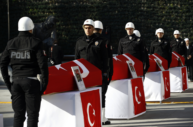 To the mournful sound of trumpets, funeral services were held at Istanbul’s police headquarters for some of the slain officers. Their comrades solemnly carried the coffins, which were draped in the Turkish flag, as a sea of mourners wept around them.