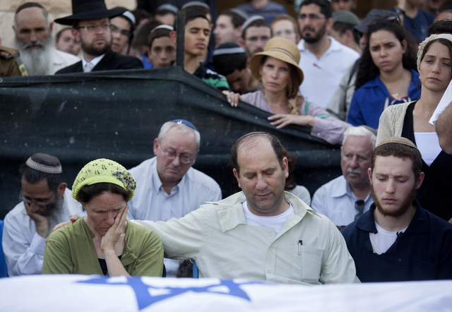 The three young men were buried side by side in the central Israeli town of Modiin. Mourners arrived in large convoys of buses arranged for the ceremony. Netanyahu and President Shimon Peres were among the speakers to eulogize the youths, whose bodies were wrapped in blue-and-white Israeli flags and laid on stretchers. Hundreds of people also attended separate memorial services in the hometowns of the three teens.