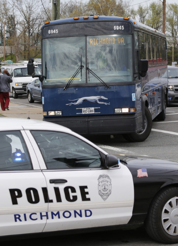 The Greyhound station is west of the city’s downtown area, across from Richmond’s minor league baseball stadium and within a former industrial area. It is on a main thoroughfare connecting a residential district to the stadium and nearby restaurants.