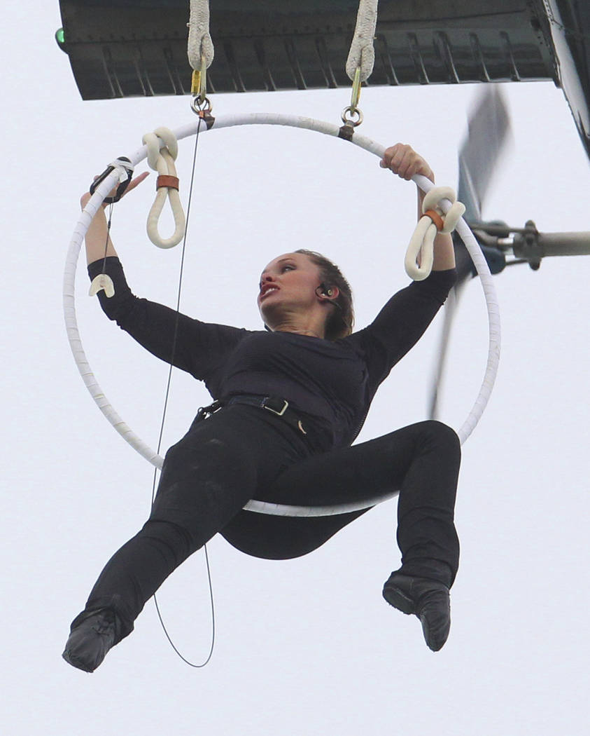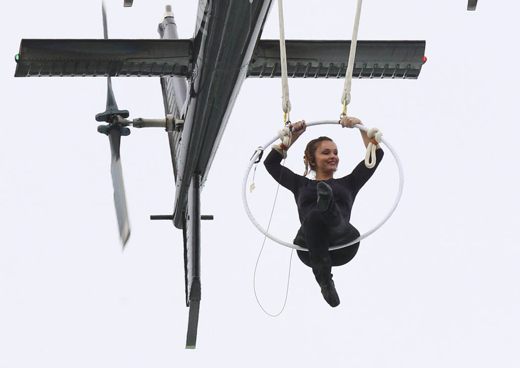 With the mist from the falls as a backdrop, Wallenda worked herself into a series of dramatic poses, waving her arms as she dangled by her knees and toes and doing handstands and splits. She hung twice by her teeth with the use of a mouth guard.