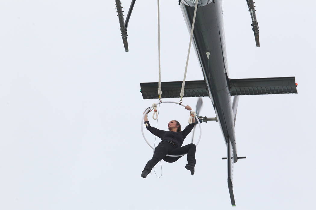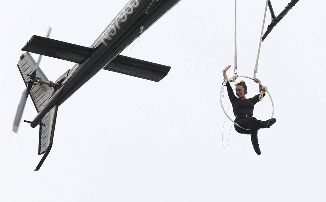 NIAGARA FALLS, N.Y. — Erendira Wallenda, the aerialist wife of daredevil Nik Wallenda, successfully hung by her teeth from a helicopter over Niagara Falls on Thursday, pulling off the stunt five years to the day her husband walked a tight rope over the falls.