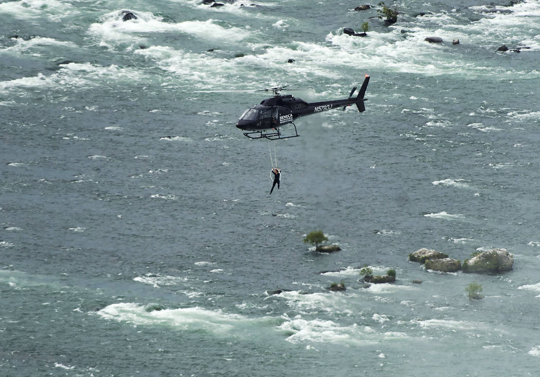 The aerialist spent about eight minutes of the 10-minute stunt hovering over the falls.
