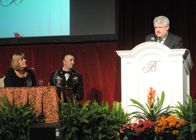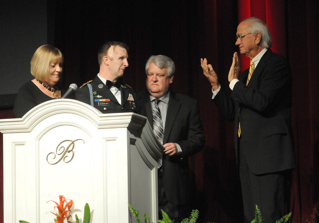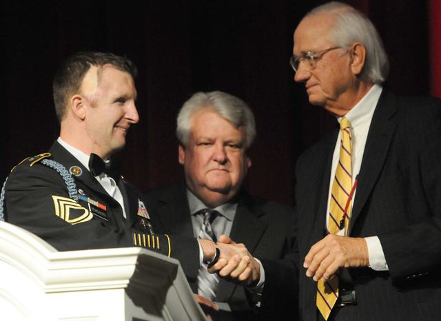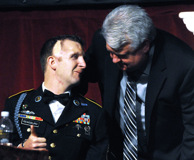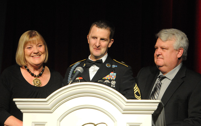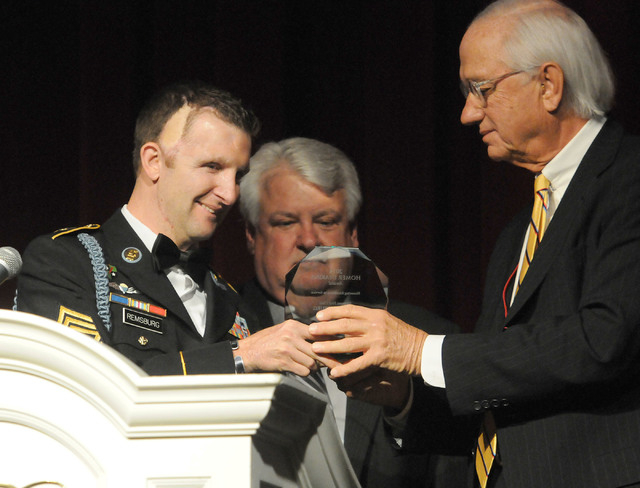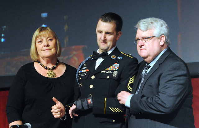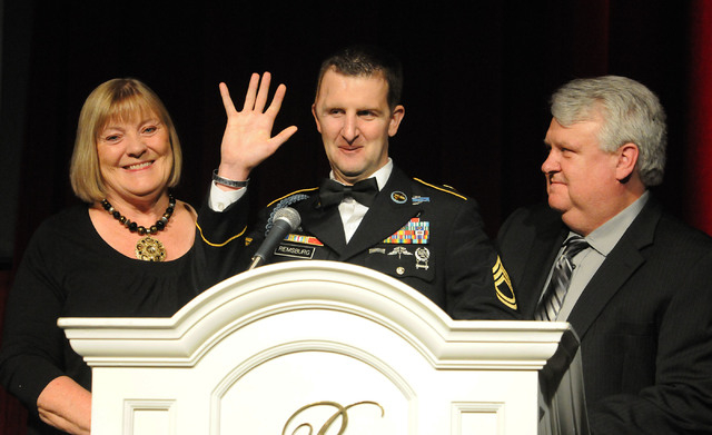 Army Sgt. 1st Class Cory Remsburg, who was recognized at President Barack Obama’s State of the Union address, received a hero’s award Thursday at the Bellagio.