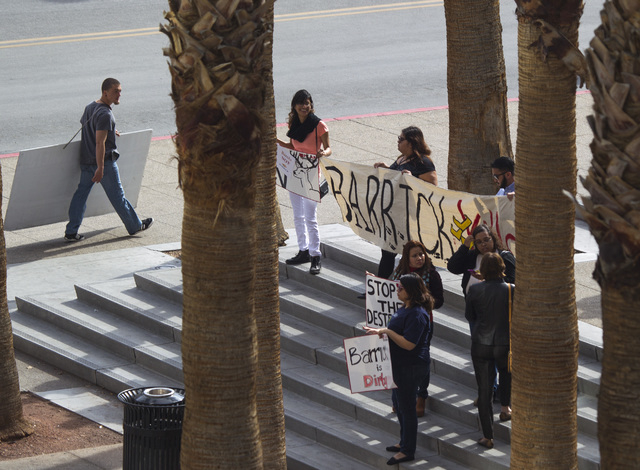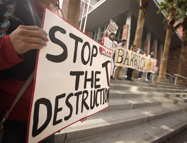 During a demonstration in front of the Regional Justice Center downtown, the group of about 15 protesters led by the Progressive Leadership Alliance of Nevada said the Silver State faces similar ecological damage from Barrick’s activities, especially the planned expansion of an open-pit gold mine in White Pine County that already is one of the largest in the United States.