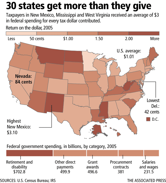 Forty-one states received more money than Nevada in return for every federal tax dollar. New Mexico received the most: $3.10.