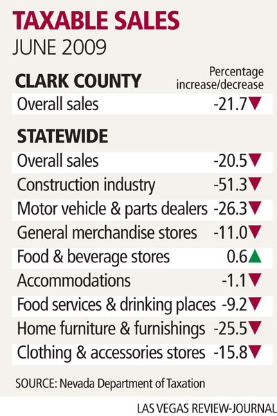 June's taxable sales show just how quickly losses accelerated toward the fiscal year's end. Nevada merchants sold $3.3 billion in goods in June, down 20.5 percent when compared with $4.2 billion in June 2008. Clark County stores moved $2.5 billion in merchandise, a 21.7 percent decline from $3.1 billion a year earlier.