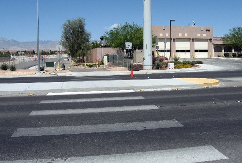Bernie is blocked: How come there is an island right in the middle of the bike path crossing of Allen Street in North Las Vegas near the firehouse? It looks like at one time the island had an opening to allow bikes to cross on the Lower Las Vegas Wash Trail unimpeded. Now one has to ride around the island, creating a safety issue. Any information you can dig up would be appreciated.